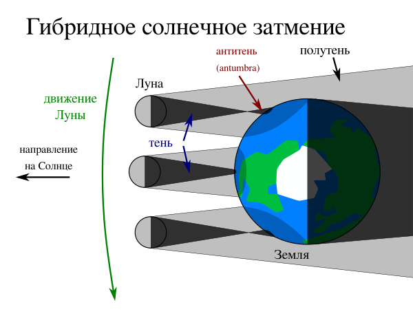 Гибридные солнечные затмения, при которых где-то на Земле наблюдается полное затмение, а где-то ― кольцеобразное, происходят вследствие кривизны земной поверхности (рис. 13). Может произойти так, что вершина конуса лунной тени во время части затмения достигает поверхности Земли, а в остальное время ― не достигает. В большинстве случаев кольцеобразная фаза наблюдается в начале и в конце затмения, а полная фаза ― в середине, но возможно и такое, что в начале затмения наблюдается кольцеобразная фаза, а в конце ― полная, или наоборот[14][30].