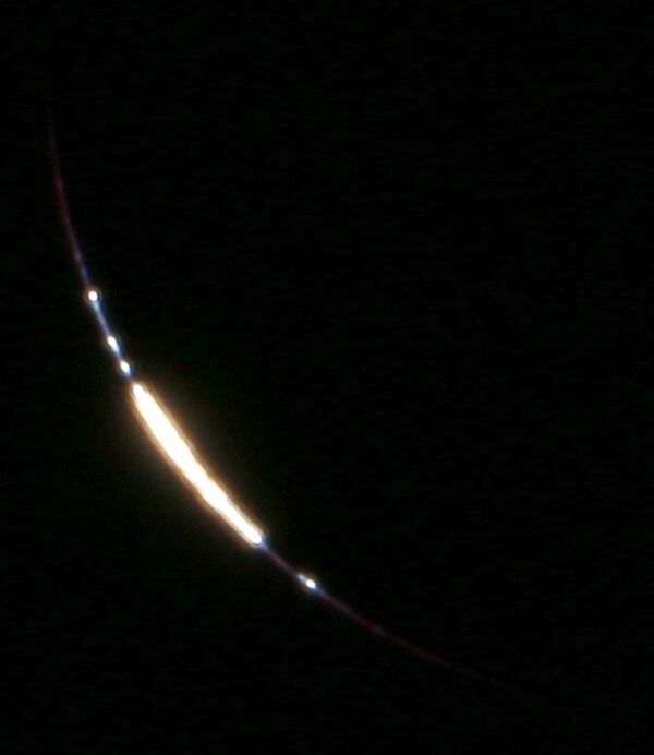 Перед наступлением полной фазы солнечного затмения и после её окончания можно наблюдать ещё два эффекта, известные как бриллиантовое кольцо и чётки Бейли. Эффект бриллиантового кольца возникает, когда Луна покрывает почти весь диск Солнца, и небо уже достаточно тёмное, чтобы вокруг Луны было видно «кольцо», а ярким «бриллиантом» на нём становится последняя часть фотосферы Солнца, оставшаяся незакрытой[88] (рис. 23, 25). Чётки Бейли — эффект, возникающий, когда почти весь диск Солнца скрыт Луной, вследствие неровностей лунного рельефа. Из-за них форма диска Луны отличается от круговой, и перед самым началом полной фазы или непосредственно после её окончания тонкий «серп» солнечного диска оказывается разделён на части. В этот момент вместо тонкого серпа видно множество небольших светящихся точек, которые выглядят как бусы, с чем и связано название эффекта[89][90] (рис. 26).