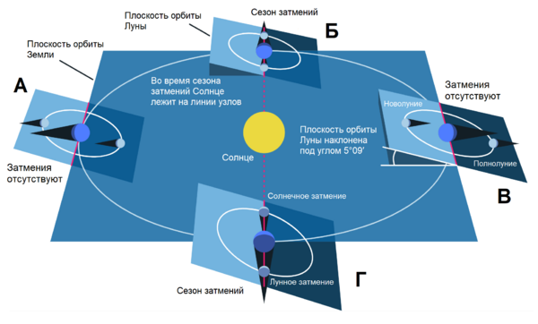 Солнечные затмения могут происходить только во время новолуний, т. е. когда эклиптическая долгота Луны и Солнца одинакова (или почти одинакова). В это время Солнце и Луна находятся на одном круге эклиптической широты. Но поскольку орбита Луны наклонена к плоскости эклиптики под средним углом 5°09′[1] (рис. 1), солнечные затмения случаются не при каждом новолунии, а лишь в тех случаях, когда Луна во время новолуния расположена вблизи одного из узлов своей орбиты. При выполнении этих двух условий Луна окажется между Землёй и Солнцем (конфигурации Б и Г на рис. 1). С точки зрения земного наблюдателя, узел лунной орбиты – это точка, в которой проекция лунной орбиты на небесную сферу пересекается с эклиптикой. Следовательно, в это время Луна находится вблизи эклиптики и поэтому может заслонить солнечный диск. В противном случае, если Луна находится далеко от узлов, она пройдёт выше или ниже диска Солнца и затмения не произойдёт (конфигурации А и В на рис. 1).