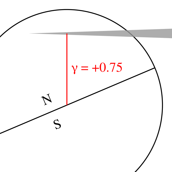 Гамма — параметр, который описывает, насколько центральным является затмение. Гамма равняется минимальному расстоянию от оси лунной тени до центра Земли в момент максимального затмения, выраженному в экваториальных радиусах Земли. Если конус лунной тени проходит к югу от центра Земли, то гамма считается отрицательной, а если к северу — положительной. Если абсолютное значение гаммы составляет менее 0,997, то происходит центральное затмение — отличие граничной величины от единицы вызвано сплюснутостью Земли у полюсов, а если больше — то нецентральное[14][47]. При этом если гамма по модулю больше 0,997, но меньше 1,026, то тень или антитень Луны может касаться Земли и тогда происходит нецентральное полное или кольцеобразное затмение. Частное затмение происходит, если гамма по модулю не превышает приблизительно 1,55 (точное значение варьируется в пределах ±0,02 и зависит от конфигурации Земли, Луны и Солнца). Если же в момент новолуния гамма по модулю превышает эту величину, то затмения, даже частного, не случается[48].