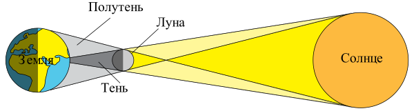 Часть пространства, в которой Луна закрывает весь свет от Солнца, называется лунной тенью и имеет форму конуса средней длиной около 373 000 км[5]. Для наблюдателя, расположенного в области тени, лунный диск целиком закрывает солнечный. Та часть, в которой свет Солнца закрыт Луной частично, называется полутенью; в этой области наблюдатель увидел бы, что лунный диск загораживает солнечный лишь частично. Также используется понятие «антитень» (англ. antumbra), обозначающее конусообразную область пространства, которая расположена центрально-симметрично тени относительно вершины её конуса (рис. 2). Для наблюдателя в антитени Луна не закрывает диск Солнца полностью из-за своего меньшего углового размера, а находится целиком на его фоне, оставляя края открытыми[6].