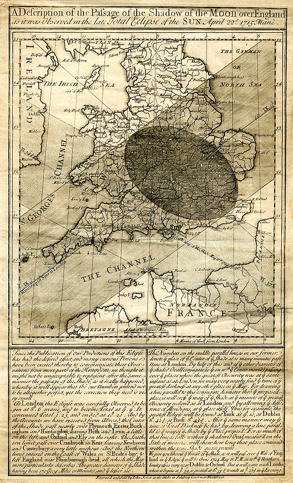Возможности предсказания затмений также развивались со временем. Например, в Древнем Вавилоне был известен сарос (см. выше), но только как период повторения лунных затмений[107][108], и другие закономерности в периодичности лунных затмений, позволявшие предсказывать эти события. Знание о повторяемости солнечных затмений через сарос позволяет определять моменты будущих затмений во времени, но положение полосы тени на поверхности Земли определять таким образом не удаётся. Солнечное затмение 585 года до н. э. было предсказано Фалесом Милетским, предположительно, при помощи знания о саросе[109] либо о других периодах, известных вавилонским астрономам. Хотя это затмение считается первым, которое достоверно было предсказано заранее[104], само его предсказание считается отчасти случайным[110]; кроме того, предсказание было сделано не для конкретной даты, а только для конкретного года[111]. Кроме того, Фалес первым объяснил солнечные затмения как покрытие Солнца диском Луны, и можно считать, что такое объяснение стало первой в истории научной теорией[112]. Устройство древнегреческого Антикитерского механизма указывает на то, что с его помощью можно было предсказывать лунные и солнечные затмения, причём не только сам факт затмения, но и некоторые его характеристики, включая фазу и время, хотя предсказания были не вполне точными[113]. Первое точное предсказание солнечного затмения, т. е. определение места и времени заранее, сделал Эдмунд Галлей для затмения 3 мая 1715 года (рис. 28). Предсказание было сделано с использованием ньютоновской теории тяготения, а его ошибка составила около 4 минут по времени и 30 км по положению полосы затмения[110].