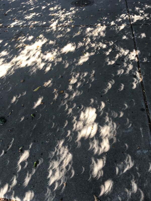 Некоторые особенности освещения проявляются во время частных фаз затмений. Например, если свет Солнца при затмении, падая на Землю, проходит через зазоры в листве дерева, то проявляется эффект камеры-обскуры: на поверхности возникает множество небольших изображений диска Солнца в виде серпа, или, иначе говоря, серповидные тени[93][94] (рис. 27). Другой эффект возникает при большой частной фазе затмения. Когда значительная часть диска Солнца закрыта Луной, его размер в одном направлении уменьшается. Из-за этого тени от предметов на Земле становятся значительно более резкими, поскольку размер «полутени» от предмета на Земле также уменьшается, причём только в том направлении, в котором Луна закрывает часть диска Солнца[95].