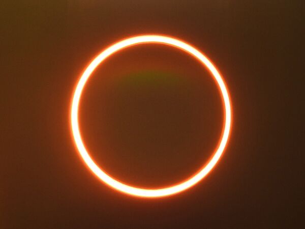 В тех случаях, когда Луна находится далеко от Земли — на расстоянии, превышающем длину лунной тени (например, вблизи апогея), — её тень не достигает Земли и полное солнечное затмение наблюдаться не может (рис. 6, снизу). Но если при этом какой-либо участок Земли попадает в область антитени, то наблюдатель на этом участке увидит лунный диск на фоне солнечного. При этом видимый угловой диаметр лунного диска будет меньше углового диаметра диска Солнца, вследствие чего край солнечного диска останется не закрытым и будет наблюдаться в виде светящегося кольца вокруг тёмного диска Луны, т. е. наблюдатель увидит стадию кольцеобразного затмения[12][13][14] (рис. 8).