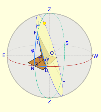 Для определённости будем считать, что часы устанавливаются в средних широтах северного полушария. На рисунке показана небесная сфера с центром в точке O. Плоскость горизонта обозначена NESW, NS — полуденная линия, Z — зенит, Z' — надир, PL — ось мира, ZNZ'S — плоскость небесного меридиана. Как известно, угол наклона оси мира к плоскости горизонта равен географической широте места наблюдения (обозначена буквой φ на рисунке), поэтому сторона OP гномона солнечных часов, обозначенного на рисунке TPO, показана совпадающей с осью мира. Угол между полуденной линией и краем тени от гномона, который нам нужно найти, обозначен α. Через t обозначен угол между кругом склонения Солнца PBL и плоскостью небесного меридиана. Положение Солнца опять-таки для определённости показано до полудня.
