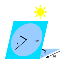 где φ — широта места установки часов, m количество часов до полудня (после полудня) через, α — угол между полуденным делением и соответствующим часовым делением, t — угол между кругом склонения Солнца и плоскостью небесного меридиана.