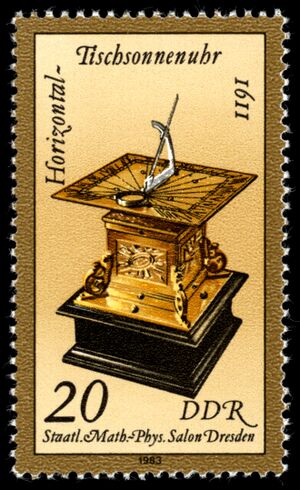 Солнечным часам в Санто-Доминго, установленным в 1753 году была посвящена серия почтовых марок Доминиканской республики 1931—1933 гг. (Sc #C10—C17)[24]. Различным старинным настольным солнечным часам посвящены четыре из шести марок серии, посвящённой экспонатам Государственного физико-математического салона в Дрездене, выпущенной в 1983 году в ГДР (Sc #2345—2348). Солнечные часы в музее Гугун вместе с мотивом государственного флага КНР изображены на почтовой марке КНР 2001 года из серии «Начало нового тысячелетия — вступление в XXI век» (Sc #3082)[25][26][27].