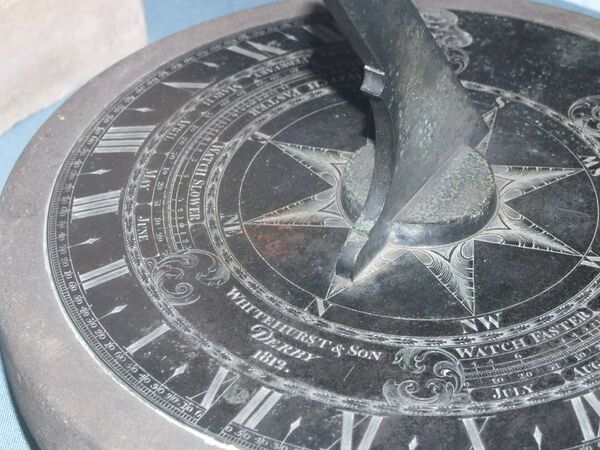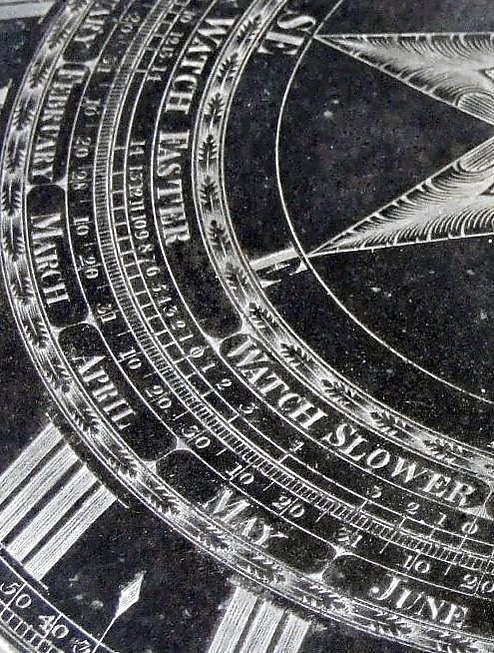 С помощью пары шкал на циферблате выполняется коррекция уравнения времени. Первая шкала предоставляет дату в месяцах и днях, а напротив этих значений на второй шкале обозначены минуты, в которые в этот день часы будет идти быстрее или медленнее. Выгравированы надписи «часы медленнее; часы быстрее; 15 апреля — первый день, когда не требуется пересчёт» (Watch Slower, Watch Faster. The 15th April is one day when no conversion needs to be made)[12]. По часам Уайтхёрстов можно было даже сверять карманные часы, которые на то время (1812) не всегда ходили корректно. К 1820 часовое производство было усовершенствовано: анкерный ход стал повсеместно признан, и отпала необходимость в частой калибровке.