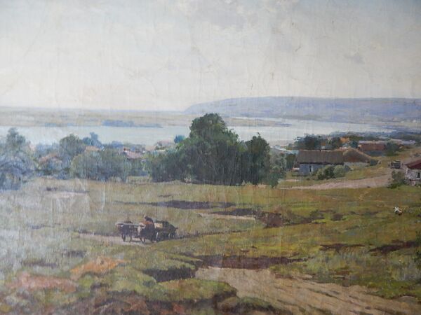 На переднем плане картины изображено плоскогорье с неглубокими оврагами и петляющей грунтовой дорогой, по которой слева движется телега, запряжённая парой быков и управляемая извозчиком. Справа на поляне у куста сидят две женщины. На втором плане вдоль широкой реки до её излучины и на высоком холме расположено большое село, утопающее в пышной зелени деревьев. Третий план занимает широкая река, слева виднеется остров, покрытый зелёной растительностью, а справа — голубовато-сероватая горная гряда с плоской вершиной, плавно спускающейся к воде на излучине. Над пейзажем простирается светлое голубовато-кремовое высокое небо. Композиция строится на чередовании планов и гармоничном сочетании природных и сельских мотивов, что характерно для жанра пейзажа.