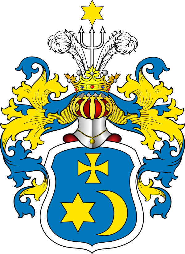 На щите дворянский коронованный шлем. Нашлемник: трезубец, увенчанный золотой звездой, между двух страусовых перьев. Намёт на щите голубой, подложенный золотом. Щитодержатель: воин.