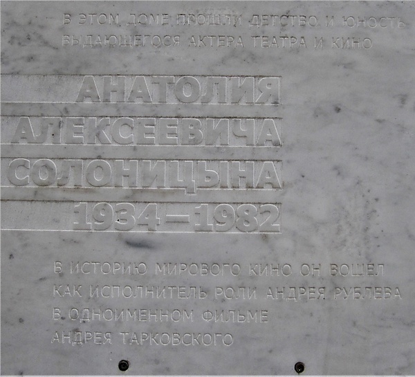Широкая известность пришла к Солоницыну после роли Андрея Рублёва в одноимённом фильме Андрея Тарковского. Прочитав сценарий фильма в журнале «Искусство кино», Анатолий Солоницын взял отпуск в театре и приехал из Свердловска в Москву. Несмотря на сопротивление многочисленных художественных советов, Тарковский утвердил малоизвестного актёра на главную роль. Кандидатуру Солоницына поддержали историки, выбравшие из предложенных Тарковским двадцати фотопроб разных актёров фотопробу Солоницына.