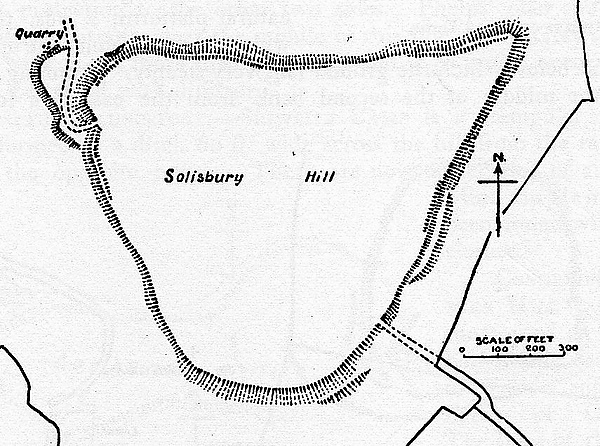 Во времена железного века Солсбери-Хилл являлся крепостью, которую занимали в период между 300 и 100 годами до нашей эры. Она состояла из треугольной области, окруженной одним сплошным валом, облицованным изнутри и снаружи массивными каменными стенами (выполненными сухой кладкой) заполненными щебнем[10]. Высота крепостного вала составляла 6 м в ширину и 4 м в высоту. Вершина холма была расчищена до основания, на ней были сооружены хижины из прутьев и глины на деревянных каркасах[11][12]. После периода оккупации некоторые из них были сожжены дотла, вал был разрушен, после чего холм больше не занимали[13][14]. Вероятно, это произошло во время вторжения белгов в Британию в начале I века до нашей эры[15].