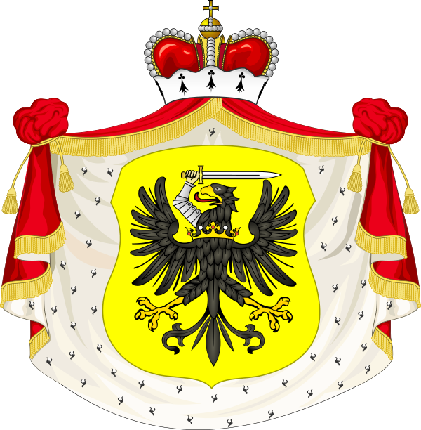 В правую сторону обращённый чёрный орел с короной на голове и поднятыми вверх крыльями. В правой лапе он держит меч, на который надета княжеская корона[1].