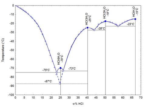 При низкой температуре хлороводород с водой даёт кристаллогидраты составов (температура плавления −15,4 °С), (температура плавления −18 °С), (температура плавления −25 °С), (температура плавления −70 °С). При атмосферном давлении (101,325 кПа) хлороводород с водой образуют азеотропную смесь с температурой кипения 108,6 °С и содержанием 20,4 мас. %[5].