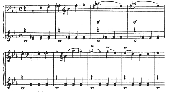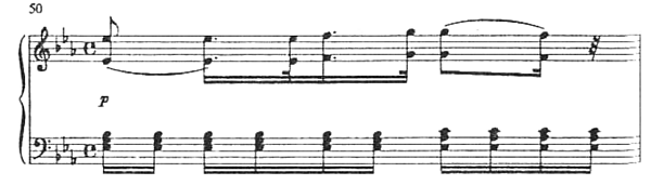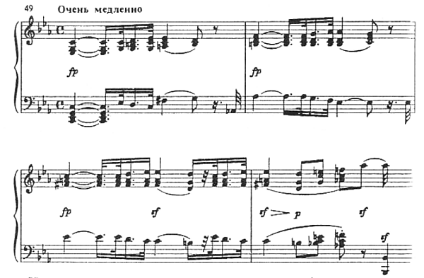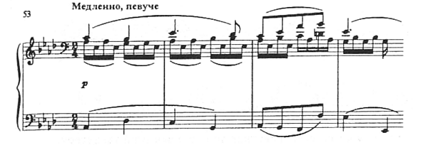 Им отвечает нежная, певучая, с оттенком мольбы, звучащая на фоне спокойных аккордов мелодия: