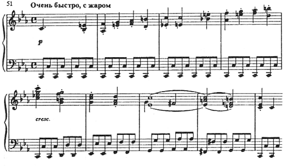 Энергия нарастает. Она прорывается с новой силой в заключительной партии (ми-бемоль мажор). Короткие фигурации ломаных арпеджио, как хлёсткие удары, пробегают по всей клавиатуре фортепиано в расходящемся движении. Нижний и верхний голоса достигают крайних регистров. Постепенно нарастание звучности от pianissimo до forte приводит к мощной кульминации, к высшей точке музыкального развития экспозиции.