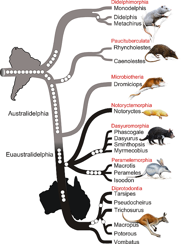 Однако в 2010 году анализ сайтов вставки ретротранспозонов в ядерной ДНК различных сумчатых, подтвердив положение соневидного опоссума в Australidelphia, также показал, что его линия является самой базальной в этом надотряде. Исследование также подтвердило, что самыми базальными из всех отрядов сумчатых являются две другие южноамериканские линии (Didelphimorphia и Paucituberculata, причём первая, вероятно, отделилась раньше). Этот вывод указывает на то, что Australidelphia возникла в Южной Америке (вместе с предками всех других современных сумчатых) и, вероятно, достигла Австралии в результате одного события расселения после отделения Microbiotheria. Окаменелости другого эоценового австралидельфия, микробиотериевого Woodburnodon casei, были описаны с Антарктического полуострова[5], а окаменелости родственного раннеэоценового woodburnodontid найдены в Патагонии[6].