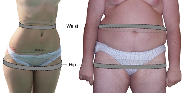 В соответствии с протоколом сбора данных Всемирной организации здравоохранения (ВОЗ),[6] окружность талии следует измерять в средней точке между нижним краем последнего прощупываемого ребра и верхней части гребня подвздошной кости. Измерение проводится устойчивой к растяжению лентой при обеспечении постоянного натяжения 100 г. Окружность таза измеряется вокруг самой широкой части ягодиц, лента удерживается параллельно полу. Другие организации используют несколько отличающиеся стандарты. Национальный институт здравоохранения США использует результаты, полученные измерением талии на уровне верхней части подвздошного гребня. Зачастую, неспециалисты измеряют окружность талии на уровне пупка, но исследования показали, что такие измерения могут недооценивать истинную окружность талии.
