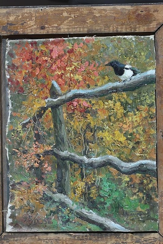 На переднем плане картины, в правом верхнем углу, изображена сорока, сидящая на самой верхней из трёх слег забора. Сквозь серый забор без штакетника на заднем плане просматривается пышная растительность, окрашенная в осенние тона. Слева, над забором, нависает ветвь дерева с листвой различных оттенков жёлтого и красного, подчёркивающей атмосферу осени. Композиция подчеркивает связь животного с окружающей природой, характерную для анималистического жанра.