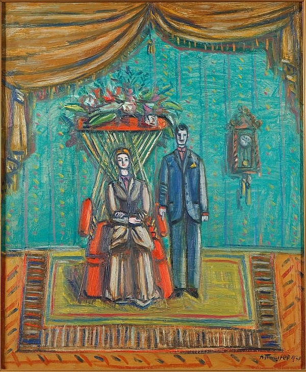 На картине в интерьере с зелёными обоями, настенными часами и коричневым занавесом фронтально изображены две фигуры. Мужчина в синем костюме стоит рядом с креслом, в котором сидит женщина. Кресло отличается крышкой, украшенной крупными цветами. Композиция подчёркивает детали интерьера и взаимодействие персонажей, а также выделяет элементы цветовой гаммы в оформлении помещения.