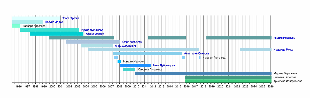 | 2. | Полина Иодис | 1995—1998 | 3 года 8 месяцев | Ксения Новикова |