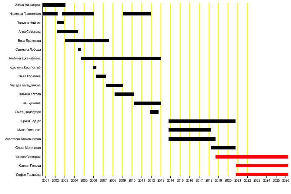 | 19 | сентябрь 2018 — октябрь 2020 | Ульяна Синецкая | 2 года 1 месяц | ||
