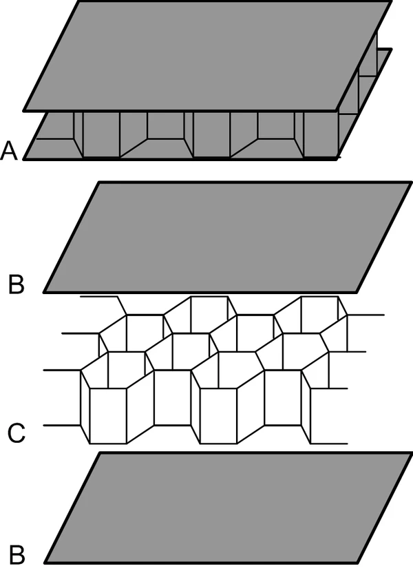 Сотовые заполнители изготавливаются с помощью процесса расширения и гофрировки из композитных материалов, таких как стеклопластик (также известный как стекловолокно), металл (обычно алюминий), полипропилен, фанера.