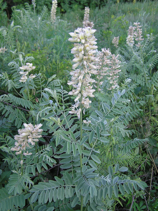 Растение покрыто шелковистыми, мягкими, прижатыми волосками. Стебель прямостоячий, крепкий, в верхней части ветвистый 30—80 см высотой. Листья 10—12 см длиной с 8—12 парами продолговато-яйцевидных листочков. Цветки собраны в верхушечную удлинённую густую кисть 5—15 см длиной. Венчик беловатый, нередко волосистый. Бобы четковидно-перетянутые 6—8 см длиной, плотно покрытые пушистыми волосками.