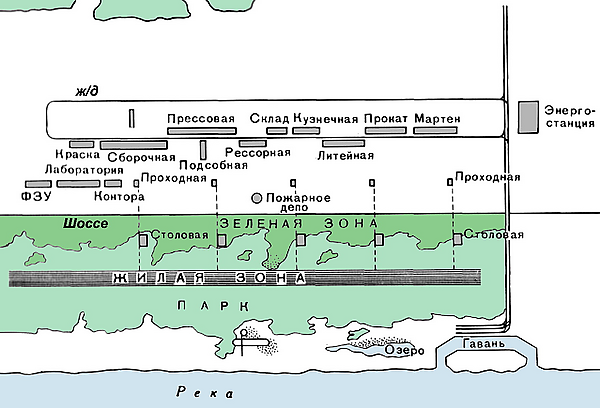 Со стороны селитебной зоны желательным было бы примыкание к городу крупного водоёма. Разместив промышленные предприятия параллельно селитебной зоне, он не только сблизил места работы и жильё, но и дал возможность линейному городу развиваться в двух направлениях, не требуя коренной реконструкции[48].