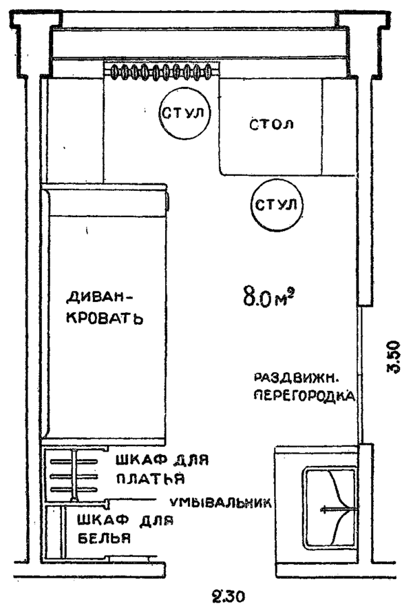 Типология и количество жилья регулировались властью. Во всех программах 1929—1930 годов сначала, в соответствии с предложениями «урбанистов», предписывалось проектировать жилищные коммуны («жилкоммуны») «на основе полного обобществления культурно-просветительной и бытовой жизни». Они понимались как комплекс корпусов, рассчитанный на 1-5 тысяч человек. Эти корпуса включали в себя жилые ячейки — спальные помещения площадью 7-9 м2 для одиноких или 2-3 человек, где можно было разместить минимальный набор мебели (в том числе трансформируемой) и умывальник. Для коллективного времяпрепровождения предусматривались спортзалы, помещения для занятий, библиотеки-читальни. Кроме того, необходимы были различные бытовые службы, хозяйственный центр с продажей товаров, информационно-обслуживающий центр, бытовой центр. Воспитание детей на коллективных началах должно было вестись в яслях, детских садах и интернатах[59].
