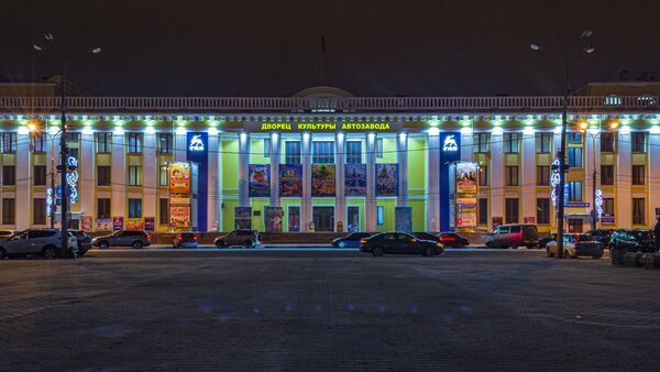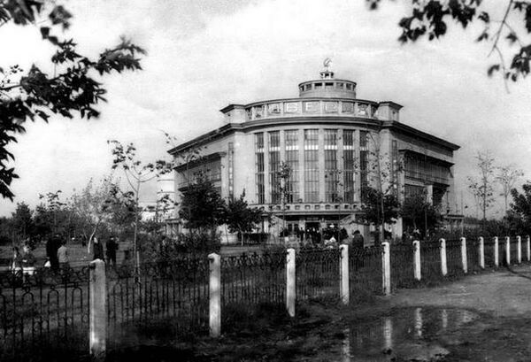 Это здание построено в 1937 году как киноконцертный зал Дворца культуры Автозавода. По периметру козырька установлены скульптуры: рабочего, колхозницы, лётчика и спортсменки[30].