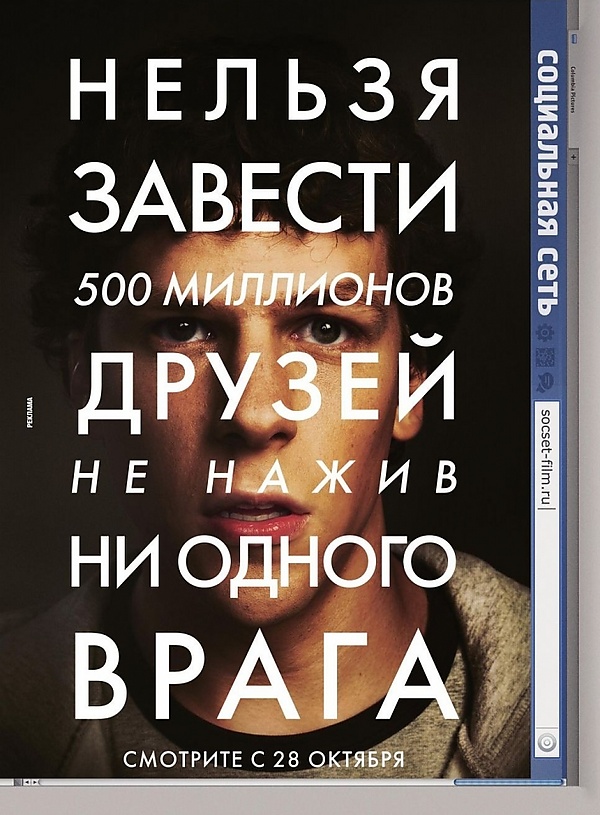 «Социа́льная сеть» (англ. The Social Network) — американская биографическая драма 2010 года режиссёра Дэвида Финчера об истории создания социальной сети Facebook[4]. Сценарий Аарона Соркина был написан по мотивам книги Бена Мезрича «Миллиардеры поневоле: как создавался Facebook, история о сексе, деньгах, гениальности и предательстве» (2009). Слоган киноленты — «Нельзя завести 500 миллионов друзей, не нажив ни одного врага»[5]. Главные роли в фильме исполнили Джесси Айзенберг, Эндрю Гарфилд, Джастин Тимберлейк и Арми Хаммер.