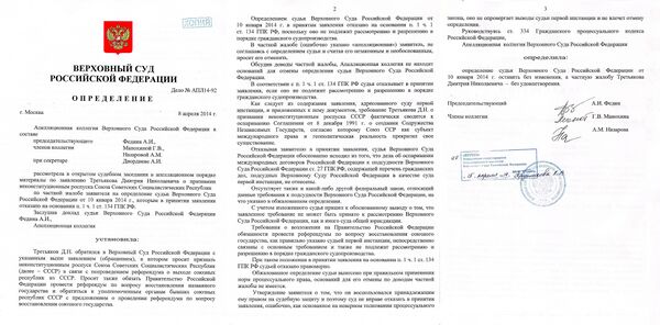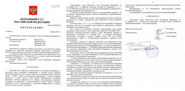 10 января 2014 года Верховный суд России судебным определением отказался рассматривать исковое заявление, сославшись на ст. 134 п. 1 ГПК РФ «(оспаривающиеся акты не затрагивают права и свободы или законные интересы заявителя)». 8 апреля 2014 года апелляционная коллегия Верховного суда РФ оставила решение первой инстанции без изменений[342][343].