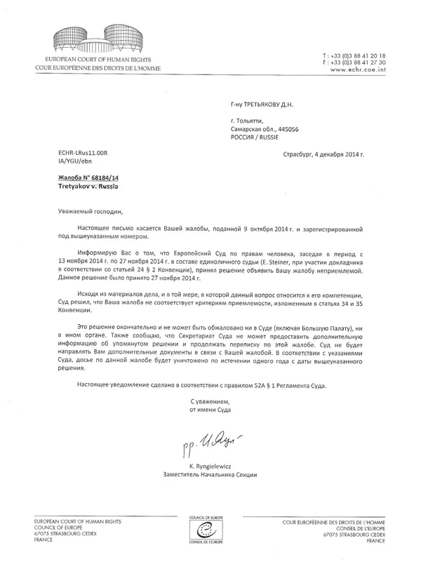 27 ноября 2014 года Европейский суд по правам человека под председательством судьи Элеоноры Штейнер отказался рассматривать жалобу россиянина, сообщив также, что решение Суда окончательно и не может быть обжаловано ни в Суде (включая Большую Палату), ни в ином органе. В соответствии с указаниями Суда, досье по данной жалобе было уничтожено по истечении одного года[346].