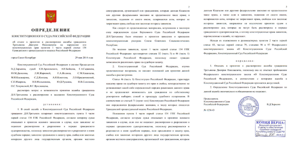 29 мая 2014 Конституционным Судом России в составе 18 судей конституционного суда под председательством В. Д. Зорькина было вынесено определение об отказе в рассмотрении жалобы, решение которого окончательно и обжалованию не подлежит[344][345].