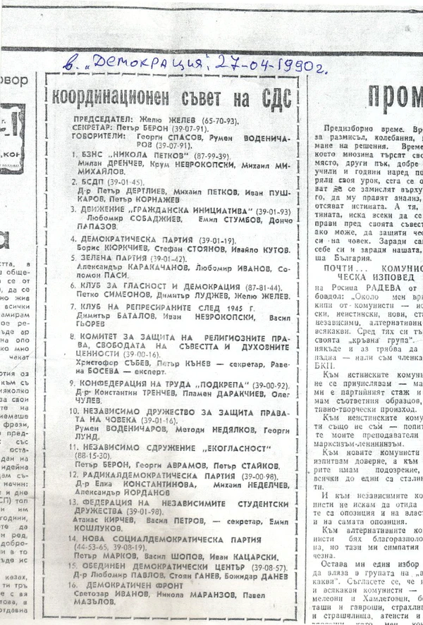 В июне 1990 года прошли первые свободные выборы с 1931 года. Их выиграла Болгарская социалистическая партия (БСП), получившая 211 место из 400, но это была пиррова победа. Занявший второе место со 144 мандатами СДС победил в крупных городах, включая столицу. Сторонники оппозиции начали кампанию гражданского неповиновения, депутаты СДС в парламенте использовали обструкционистскую тактику. Власть принадлежала БСП, но она вынуждена была делать то, что диктовала улица, направляемая СДС. В результате 6 июля подал в отставку с поста президента Пётр Младенов. 23 июля из мавзолея вынесли тело Георгия Димитрова. 1 августа парламент избрал президентом Ж. Желева[1].