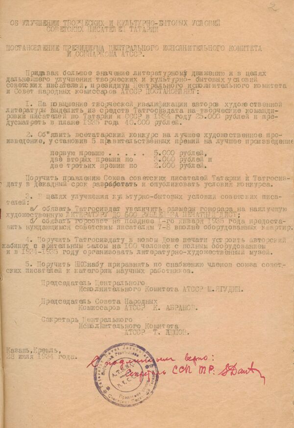 25-29 июля 1934 года в Казани состоялся I Всетатарстанский съезд советских писателей. На нём с докладами о татарской советской литературе и её жанрах выступили Гумер Гали, Галимджан Нигмати, Риза Ишмурат, Карим Тинчурин, Фатих Карим. В дни работы съезда Президиум Центрального Исполнительного Комитета и Совет Народных Комиссаров Татарской АССР приняли специальное решение об улучшении творческих, культурных и бытовых условий советских писателей.