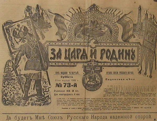 Первая крупная организация в среде русских крайних правых, называлась Русским собранием. Она была создана в конце 1900 года. Эта организация была чисто элитарной, не имевшей влияния ни в народе, ни в среде интеллигенции. Главной целью Собрания объявлялась борьба с космополитизмом верхнего слоя русского общества, средства борьбы — развитие образования и культуры для подготовки условий для «пробуждения и выражения национальных чувств»[6]. Эта элитарная организация не могла быть противовесом нарастающей революционной волне. После оглашения в октябре 1905 года царского манифеста, декларировавшего некоторые политические свободы, Русское собрание обратилось к общественности с политическим воззванием. В этом воззвании его авторы выражали горячую веру в монархию и церковь и требовали принять особые антиеврейские законы[7].
