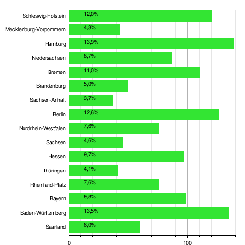 | Поддержка партии на федеральных выборах 2017 года по землям: пропорциональное голосование |