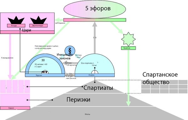 Основой спартанской политической системы являлась большая ретра, авторство которой приписывается легендарному законодателю Ликургу[23]. Власть апеллы (народного собрания) была ограниченной. В отличие от Афин, спартанское народное собрание не обладало правом законодательной инициативы. Собиралось оно нерегулярно и только утверждало предложенные герусией законы путём простого голосования. Какие-либо дебаты в ней не допускались. В полномочия апеллы также входил выбор членов герусии, которая состояла из 30 человек. В этот законодательный и судебный орган входили 2 царя и 28 избранных геронтов. Геронтом мог стать любой спартиат, достигший 60-летнего возраста[28].
