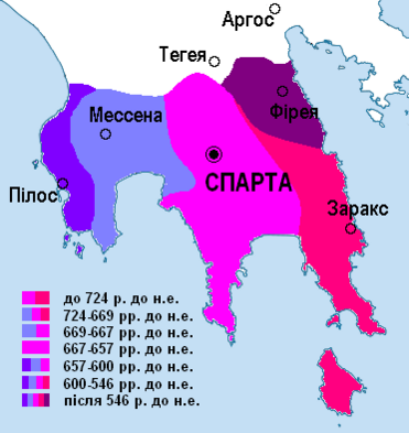 С победой в Мессенских войнах (743—723 и 685—668 гг. до н. э.) Спарте удалось окончательно покорить Мессению, после чего древние мессенцы были лишены своих земельных владений и обращены в илотов. О том, что внутри страны в это время не было покоя, свидетельствует насильственная смерть царя Полидора, расширение полномочий эфоров, что повлекло ограничение царской власти, и высылка парфений, которые под начальством Фаланфа основали в 707 году до н. э. Тарент. Однако, когда Спарта после тяжелых войн победила аркадян, особенно, когда вскоре после 660 год до н. э. заставила Тегею признать свою гегемонию, и по договору, который хранился на поставленной вблизи Алфеи колонне, вынудила заключить военный союз, с тех пор Спарта считалась в глазах народов первым государством Греции[6]. Спартанцы импонировали своим почитателям тем, что пытались свергнуть тиранов, которые с VII века до н. э. появлялись почти во всех греческих государствах[7][8]. Спартанцы способствовали изгнанию Кипселидов из Коринфа и Писистратов из Афин, освободили Сикион, Фокиду и несколько островов Эгейского моря. Тем самым спартанцы приобрели себе в разных государствах благодарных и знатных сторонников.