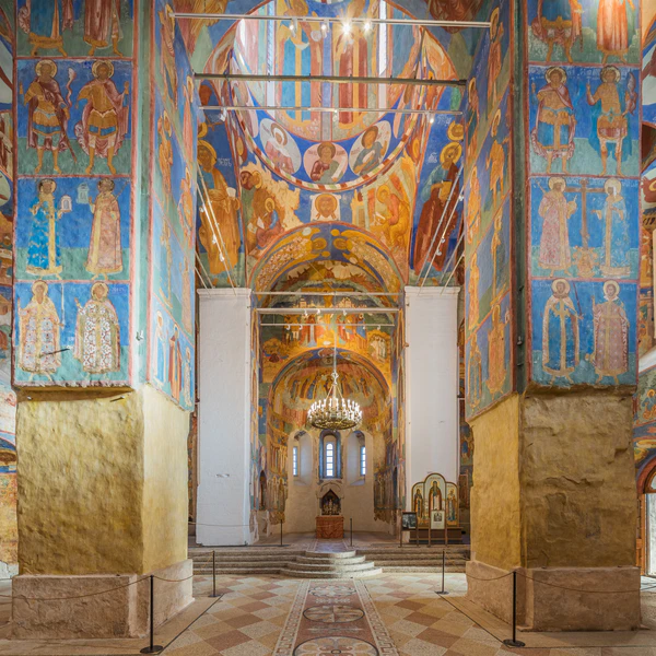 Пространство в интерьере собора организовано четырьмя мощными столпами и глубокими алтарными апсидами. Роспись была выполнена в XVII веке артелью художников под руководством Гурия Никитина[1]. Во второй половине XIX века фрески Никитина были поновлены, а в конце 1970-х годов началась кропотливая работа по раскрытию первоначальной росписи, которая к настоящему времени почти завершена.