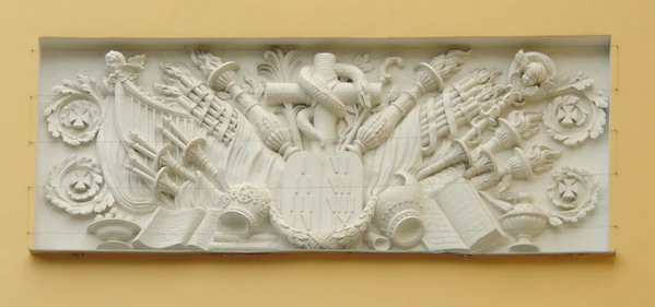 Высокие полуциркульные окна закомпонованы в ниши с балюстрадами и оформлены орнаментальными архивольтами. Стены собора также декорированы лепными панно с воинскими атрибутами.