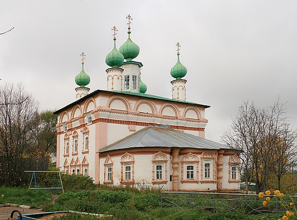 Четверик храма имеет по углам широкие лопатки. Под свесами кровли расположены ложные закомары, по три — на узких северной и южной стенах, по четыре — на восточной и западной. Закомары были расписаны, росписи частично сохранились. На ровной поверхности стен выделяются узорные наличники окон. Алтарная часть выглядит слишком широкой из-за пропорций храма. Окна алтарной части также отделаны красивыми наличниками. Особенностью оформления алтаря является массивные фигурные полуколонки, разделяющие три алтарных части. Напрашивается некоторая ассоциация с колоннами крыльца Троицкой церкви, которая строилась одновременно.