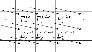 Дважды градуированная спектральная последовательность содержит большое количество данных, но существует способ визуализации, который делает структуру спектральной последовательности более понятной. Мы имеем три индекса, r, p и q. Представим, что для каждого r у нас есть лист разграфленной бумаги. На этом листе пусть p увеличивается в горизонтальном направлении, а q — в вертикальном. В каждой точке решётки мы имеем объект .