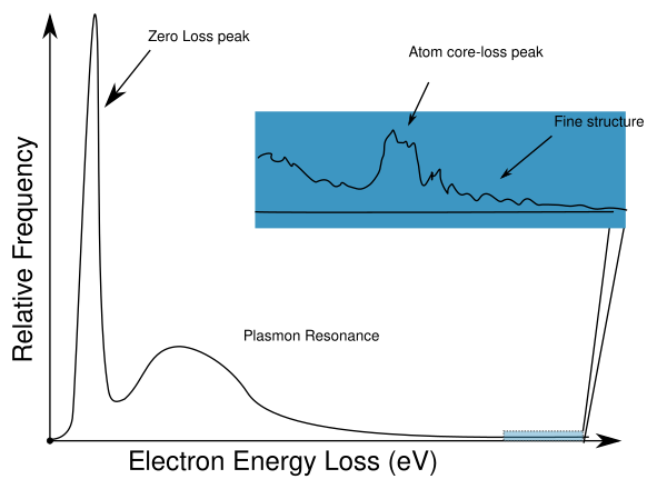 - Измерить EELS спектр в диапазоне энергий −5..200 eV (больше — лучше). Такое измерение возможно произвести за малое время выдержки (миллисекунды), так что может производиться на нестабильных под элеронным пучком веществах.