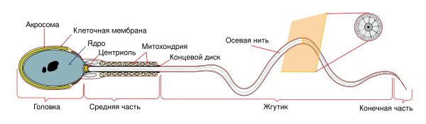 Сперматозоид мужчины имеет типичное строение и состоит из головки, средней части и хвоста.
