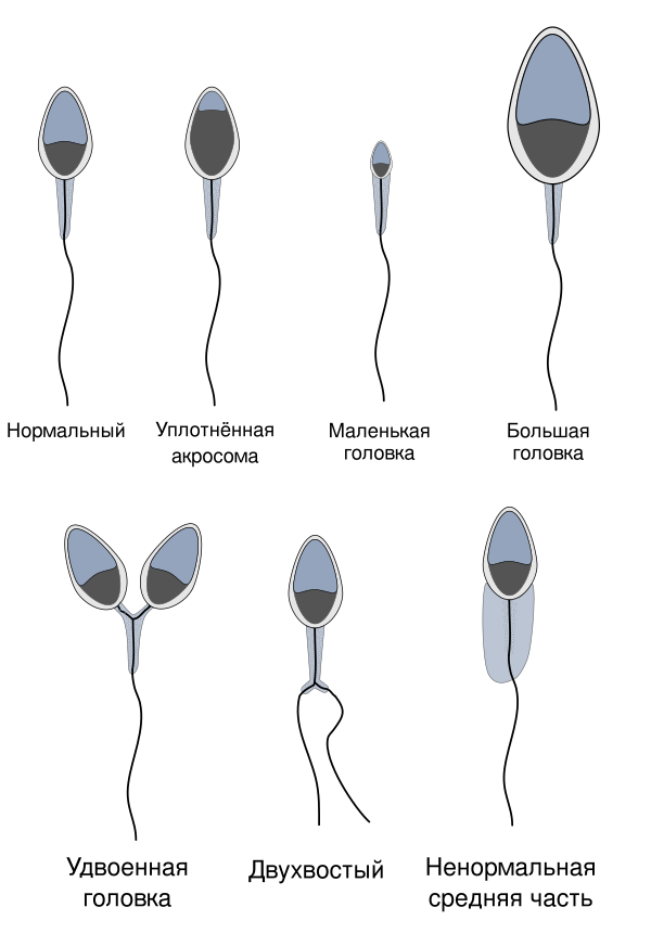 - тератозооспермия — морфология сперматозоидов ниже нормативного значения;