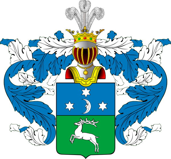 На щите дворянский коронованный шлем. Нашлемник: три страусовых пера. Намёт на щите голубой, подложенный серебром.