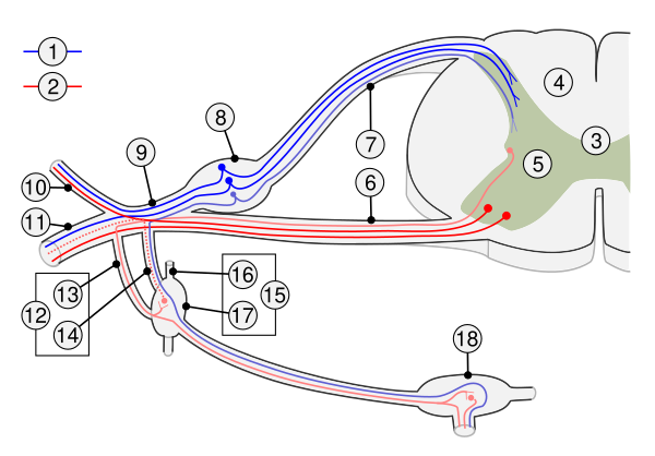 Дендриты нейронов в составе чувствительной (афферентной) части смешанных спинномозговых нервов направляются на периферию и заканчиваются там рецепторами. Аксоны (эфферентная часть) в составе заднего корешка идут в спинной мозг.